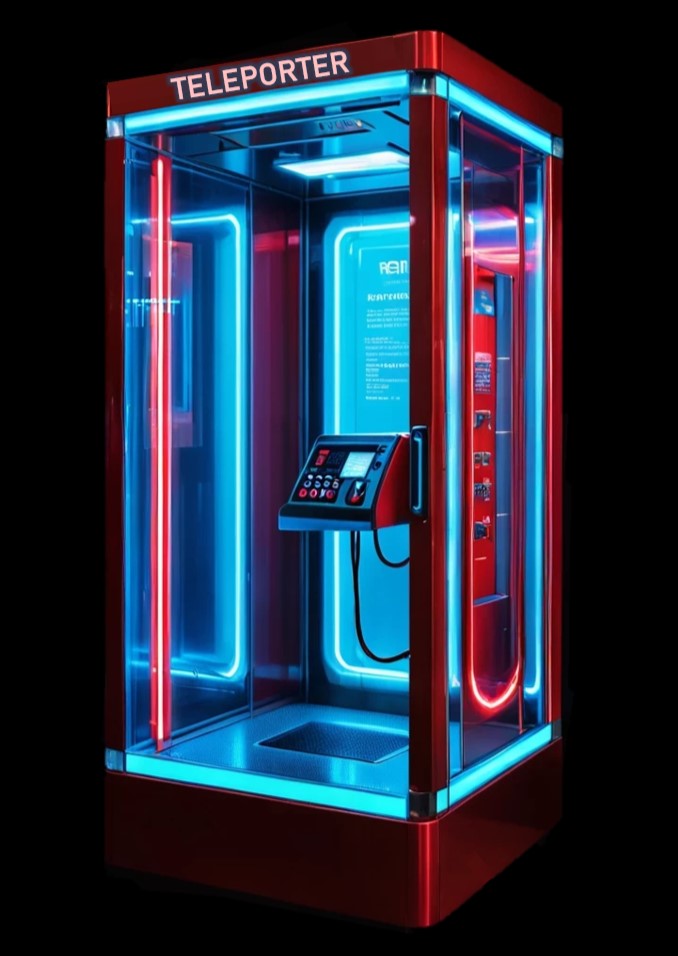 This teleporter combines the design of a classic telephone cabin with teleportation technology, providing a stylish way to travel.